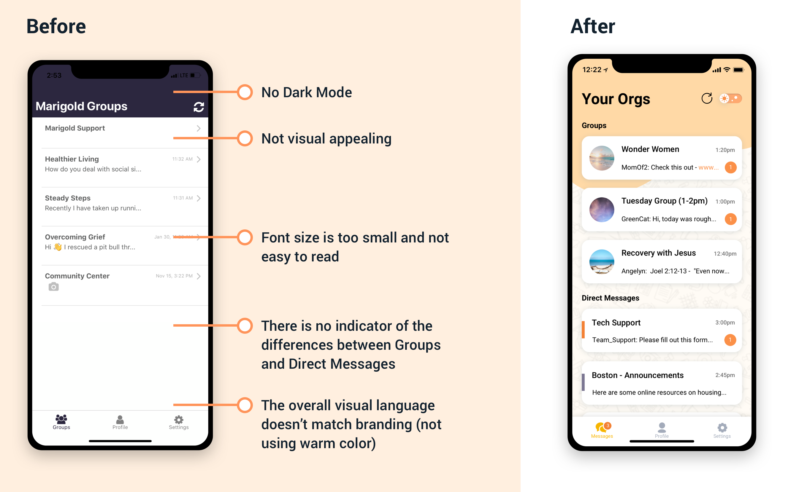 Marigold App is a tool to complement patients’ treatment with a small, anonymous support group of peers in recovery. I led the UI refresh of the whole app.