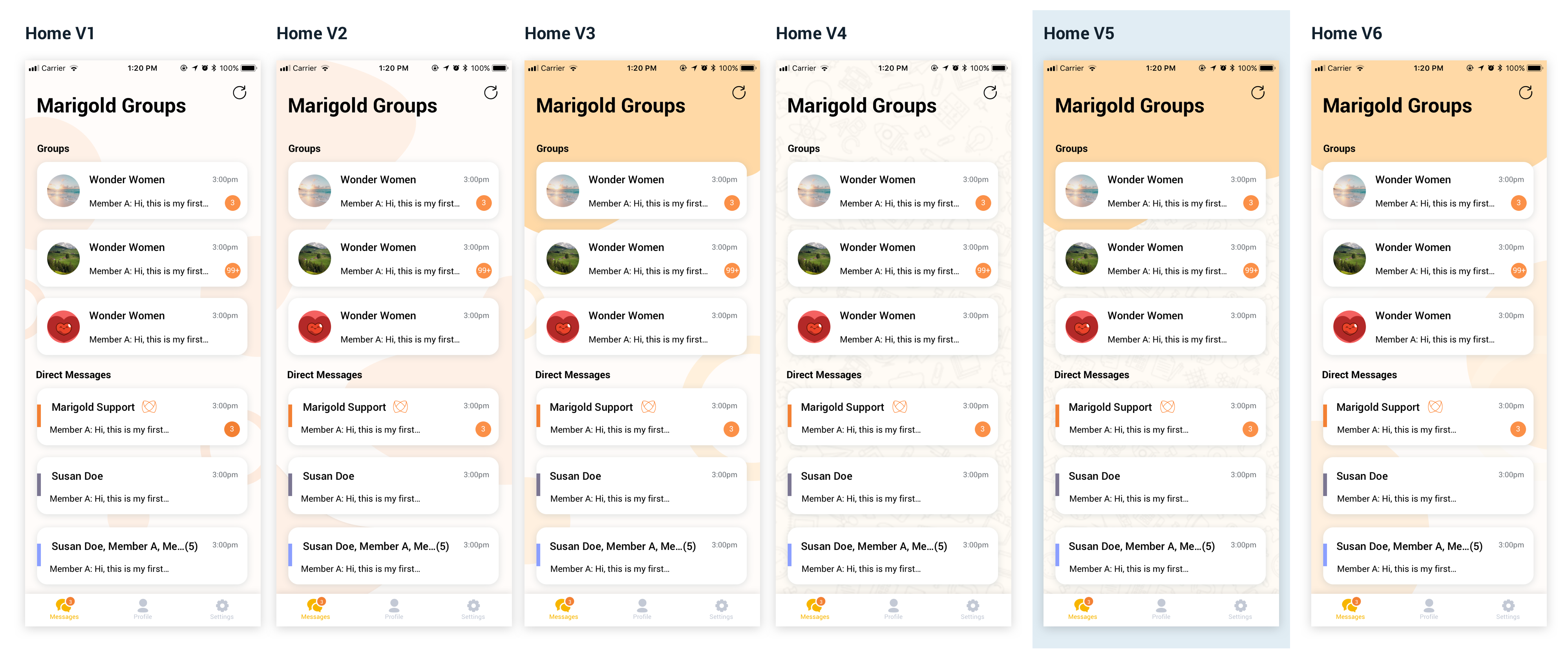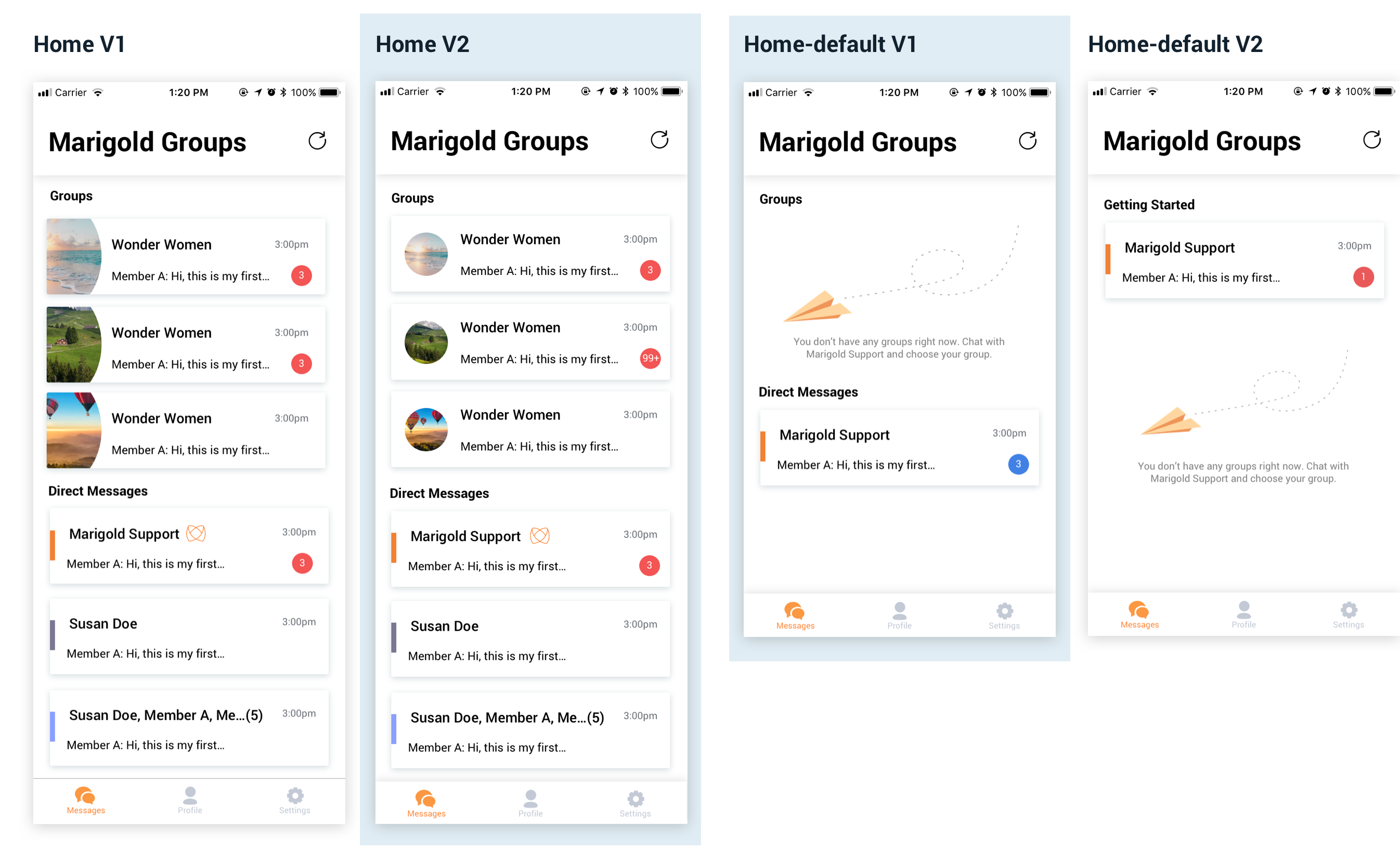 I tested these designs with some of my colleagues internally. All of them preferred V2 with circle images. For the default page, they preferred V1 because people have already confused about group messages and Direct Messages, it's not good to move things around by having a 'Getting Started' section.