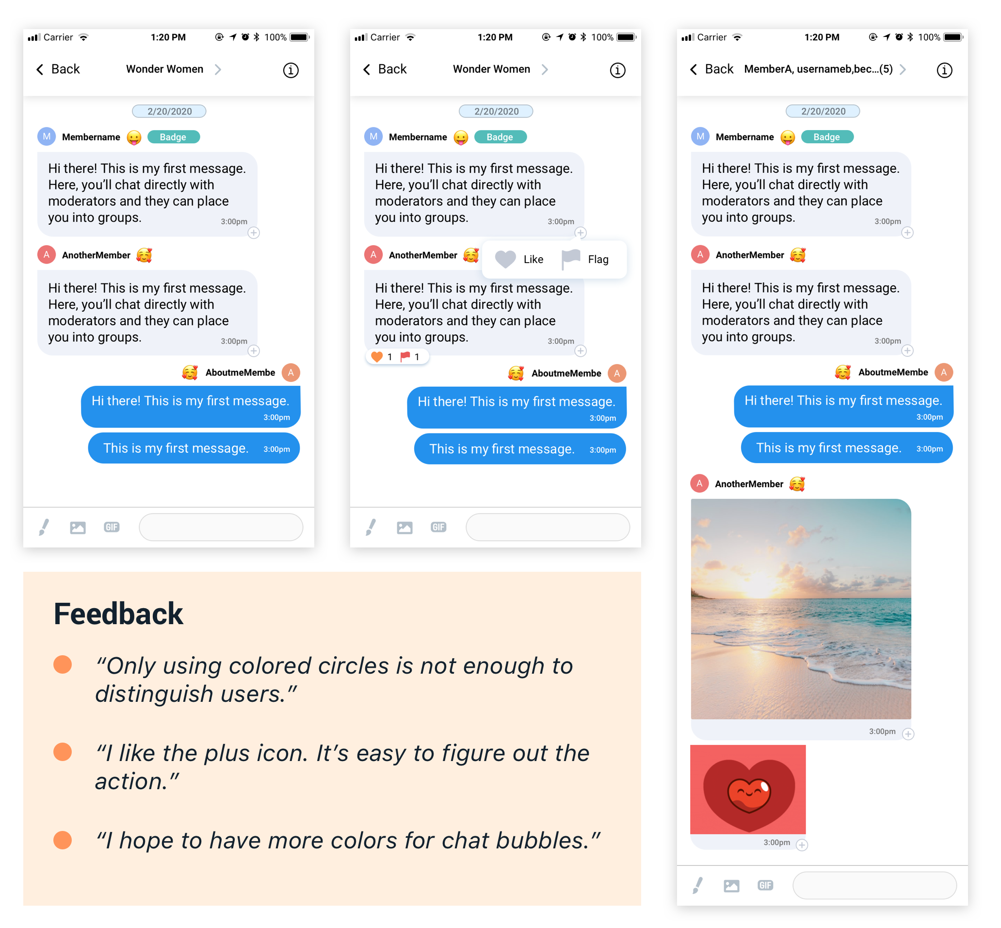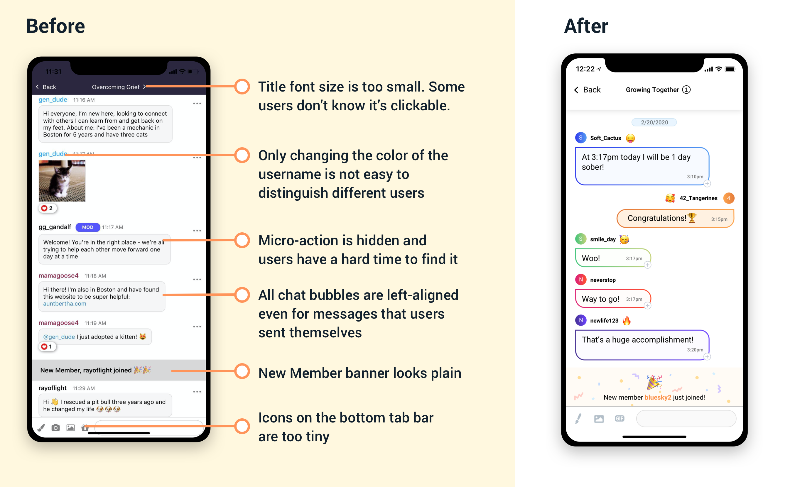 After did some competitor analysis, I drafted the initial version to get user's feedback. The idea was to add a circle before the username and use different colored circles to distinguish them.