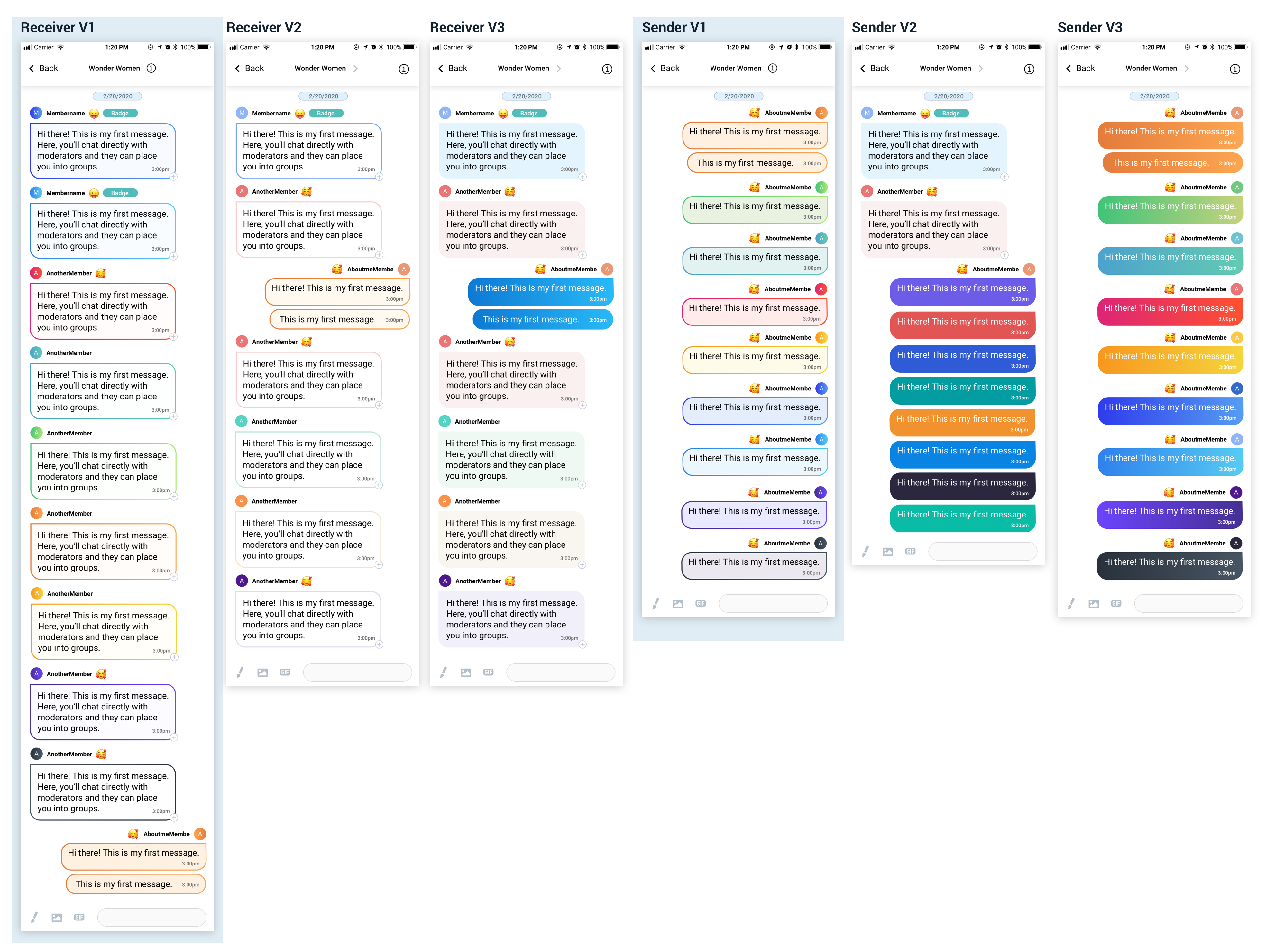 I tested these three versions, and V1 got the most votes. People love gradient color but it's too much for the chat bubble background and it'll cause readability issues. So we decided to use gradient outlines and circles but plain background color.