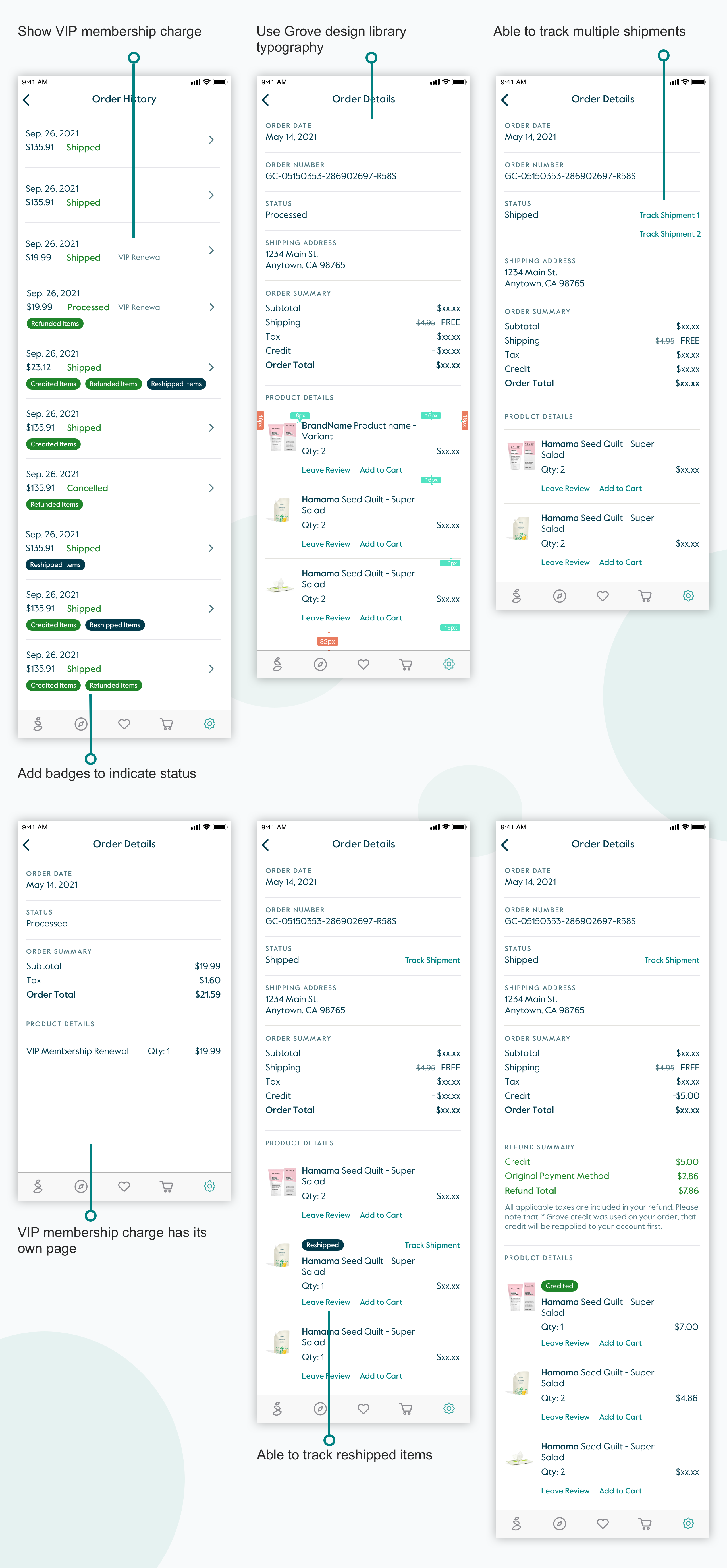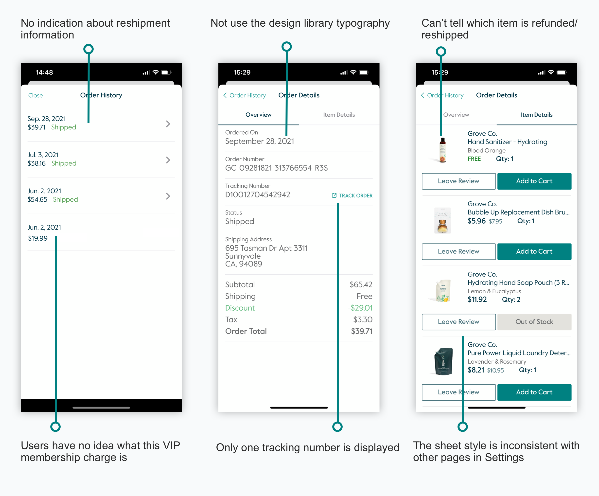 Given the guidelines from public company readiness, there were a few key parts missing for the Order History page, especially the refund and reshipment information. Customers couldn’t tell what that $19.99 VIP membership charge is about from this page and it's not clickable. Speaking of the visual style, this section didn’t use typography from Grove’s core design library.
